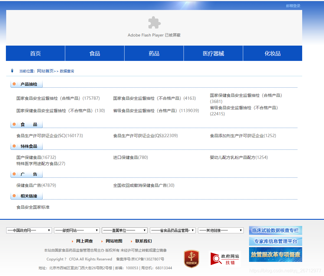 在采集某些网站时,目标网站为了防止别人分析调试前端代码,采取了反调试措施。其中一种做法是当你按F12进入浏览器控制台后,浏览器会自动命中debugger断点,并且无限循环,导致无法调试。以食品药品监督管理总局数据查询网站为例。如下图: